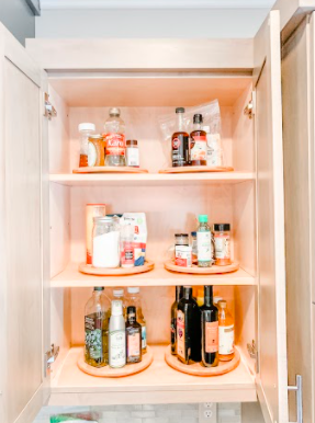 Use lazy susans to store medication, spices, jars, and so much more! We almost always add these in clients’ homes for oils and vinegars near the stove. It makes it easy to see the entire depth of the shelf with just a flick of the wrist.