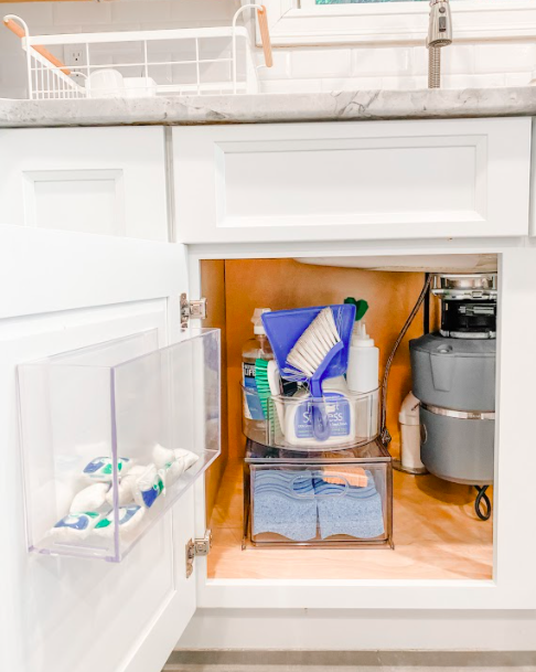 Last but not least, use all the space you have, even if it's in the back of a cabinet. We love using these iDesign adhesive bins underneath the kitchen sink to hold dishwashing pods and sponges. You can also use them in bathrooms to hold hair ties, brushes, and soaps.
