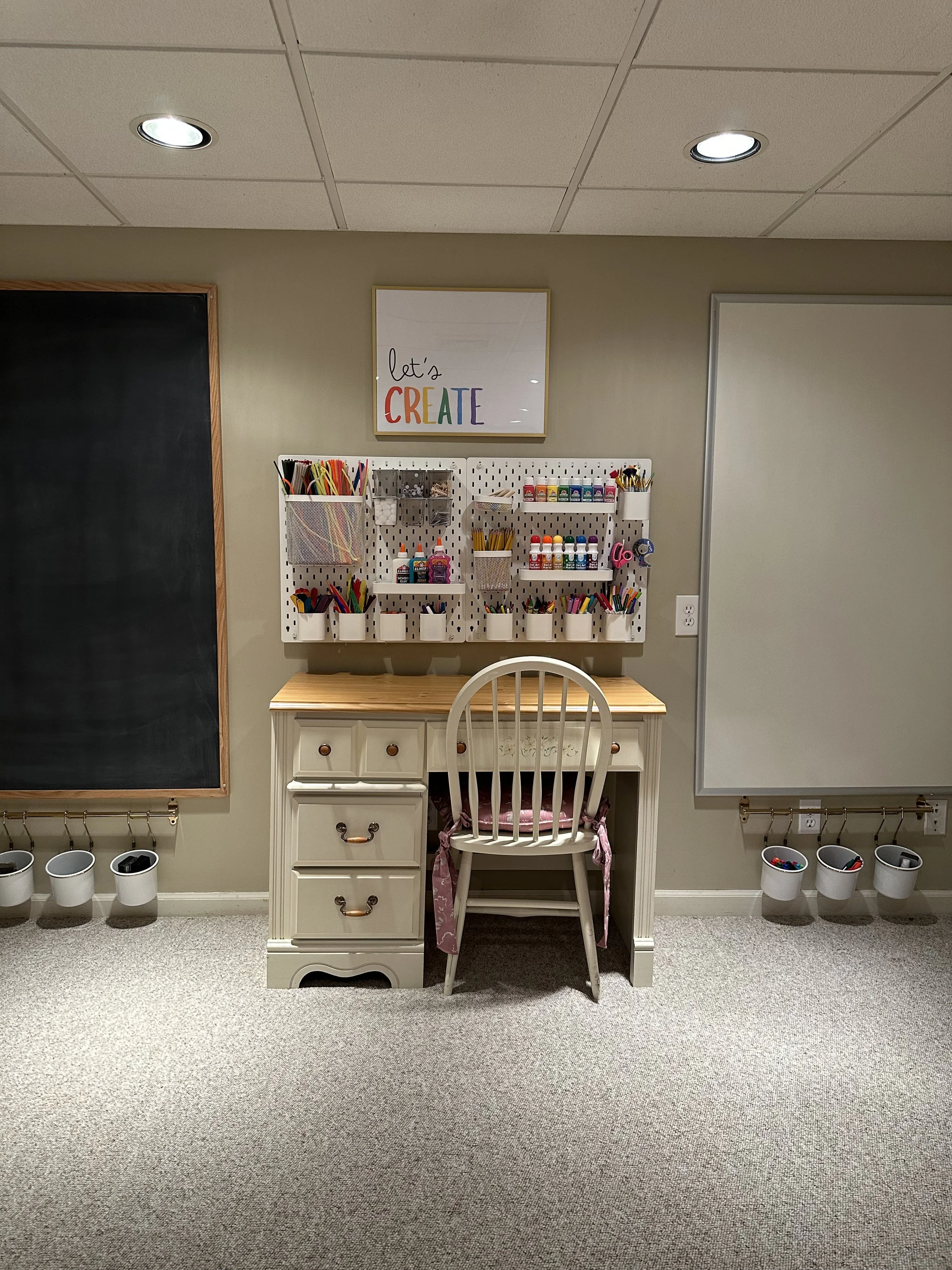 Arts + Crafts Zone with a repurposed desk and a pegboard-like wall for scissors, crayons, and supplies.