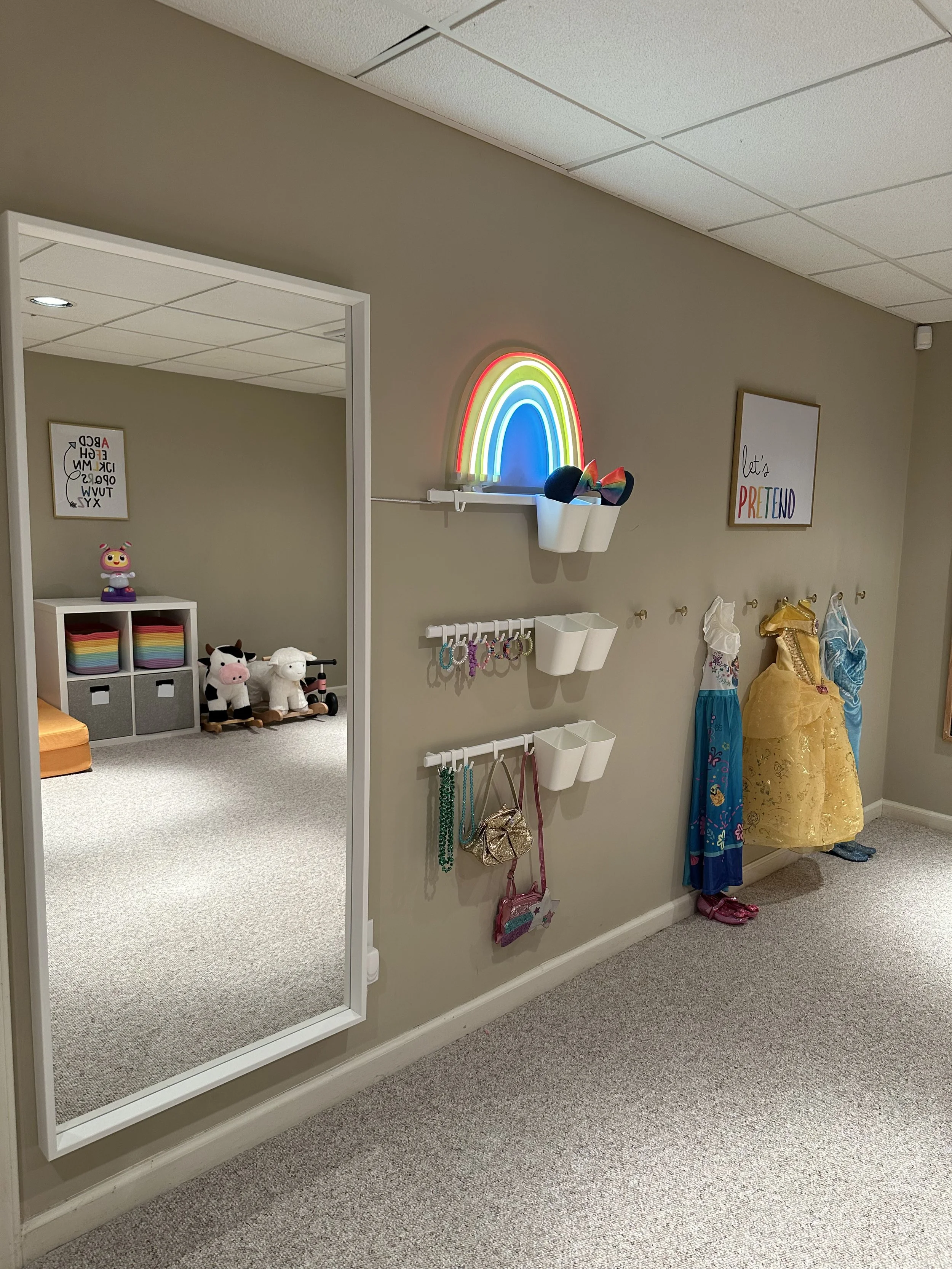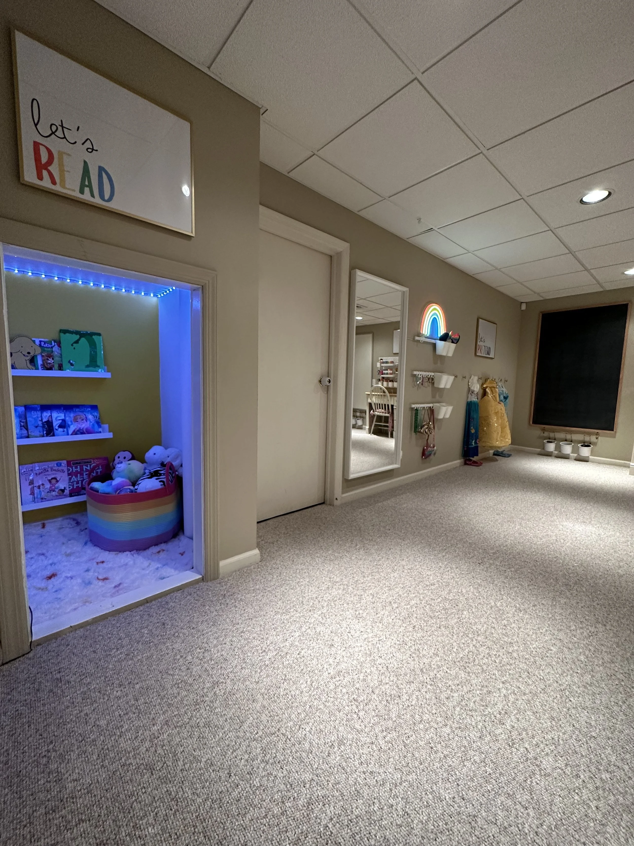 The space had a charming under-the-stairs nook that Carol turned into a cozy reading spot with floating ledges, hung pictures, a soft rug, and piles of pillows and stuffed animals. She added a big mirror with gold hooks nearby for a dress-up corner and displayed shoes neatly underneath—it was a dream setup for pretend play.